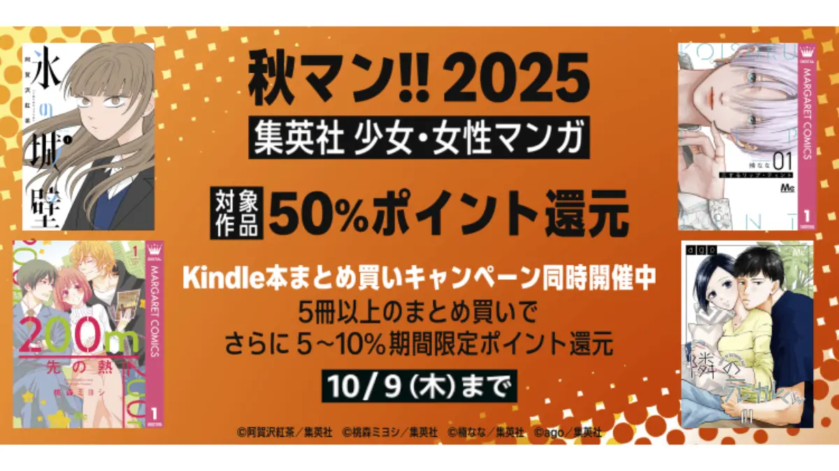 Amazonの電子書籍ストア「Kindle」において、「秋マン!!2025 集英社 少女・女性マンガ 50%ポイント還元キャンペーン」を10月9日までの期間限定で開催中です。