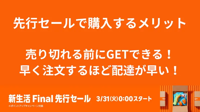 先行セールと本セールどちらの期間とも同じセール価格、ポイントアップキャンペーン対象でお買い物ができるので、本セールまで待つ必要はありません。