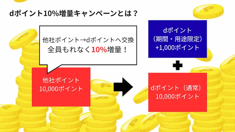 「ポイント交換でdポイント10%増量キャンペーン」の詳細・注意事項は、dポイントクラブアプリ・公式サイトで確認してください。