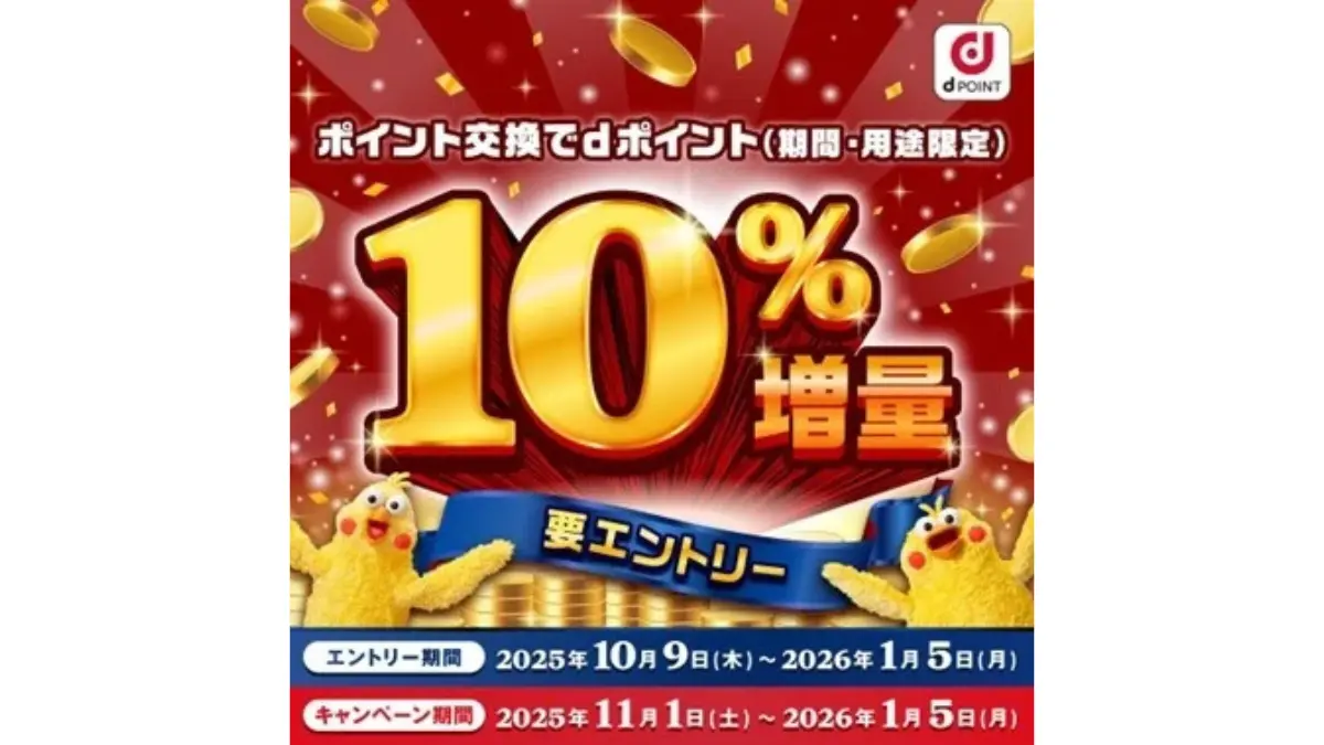 「ポイント交換でdポイント10%増量キャンペーン」の詳細・注意事項は、dポイントクラブアプリ・公式サイトで確認してください。