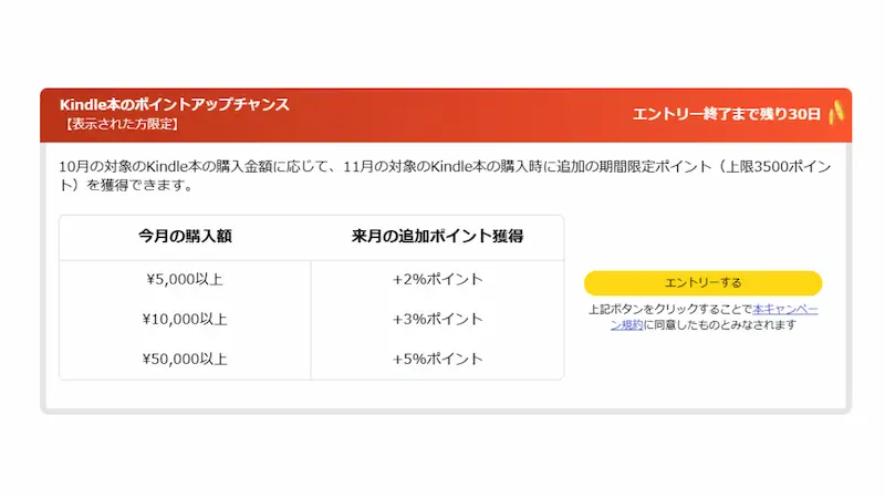 10月にKindle本を多く購入すれば、11月に購入する際に最大+5%還元(上限3,500ポイント)を受けることができます。